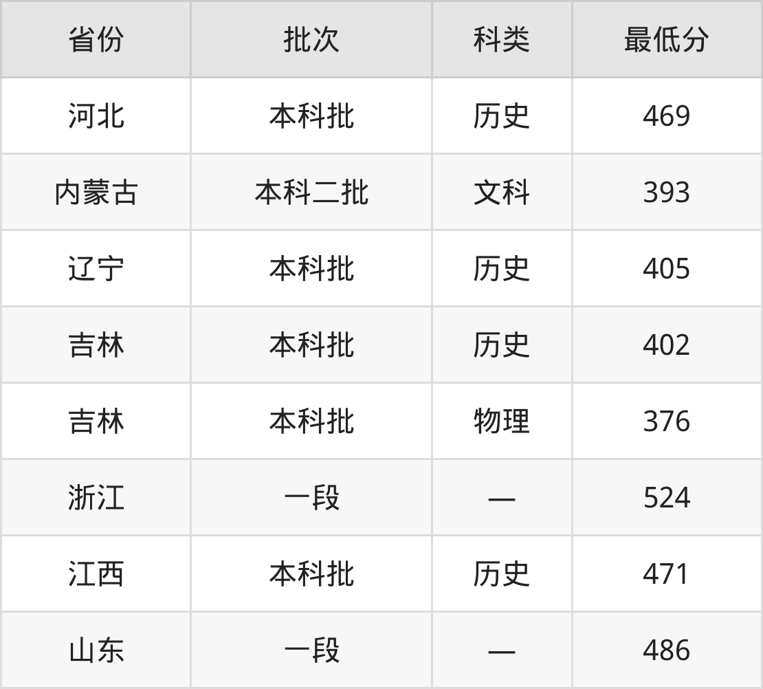 长春光华学院工商管理专业在全国各省最低录取分数线为376分(吉林物理类),除此之外,在其余地区的最低分为辽宁历史类405分、浙江524分、江西历史类471分、山东486分等,以上数据均为2024年数据,供2025年高考生参考。