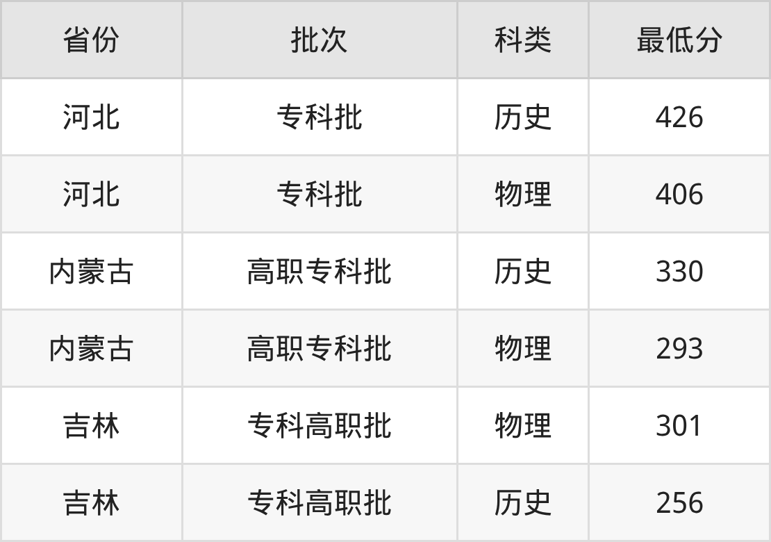 石家庄理工职业学院护理专业在全国各省最低录取分数线为256分(吉林历史类),除此之外,在其余地区的最低分为河北物理类406分、内蒙古物理类293分,以上数据均为2025年数据,供2026年高考生参考。