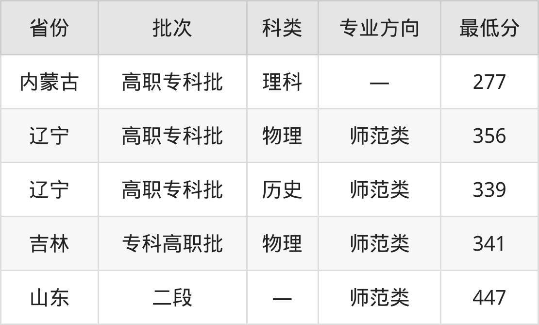 铁岭师范高等专科学校小学科学教育专业录取分数线从277分到447分不等,最低分数线如下: