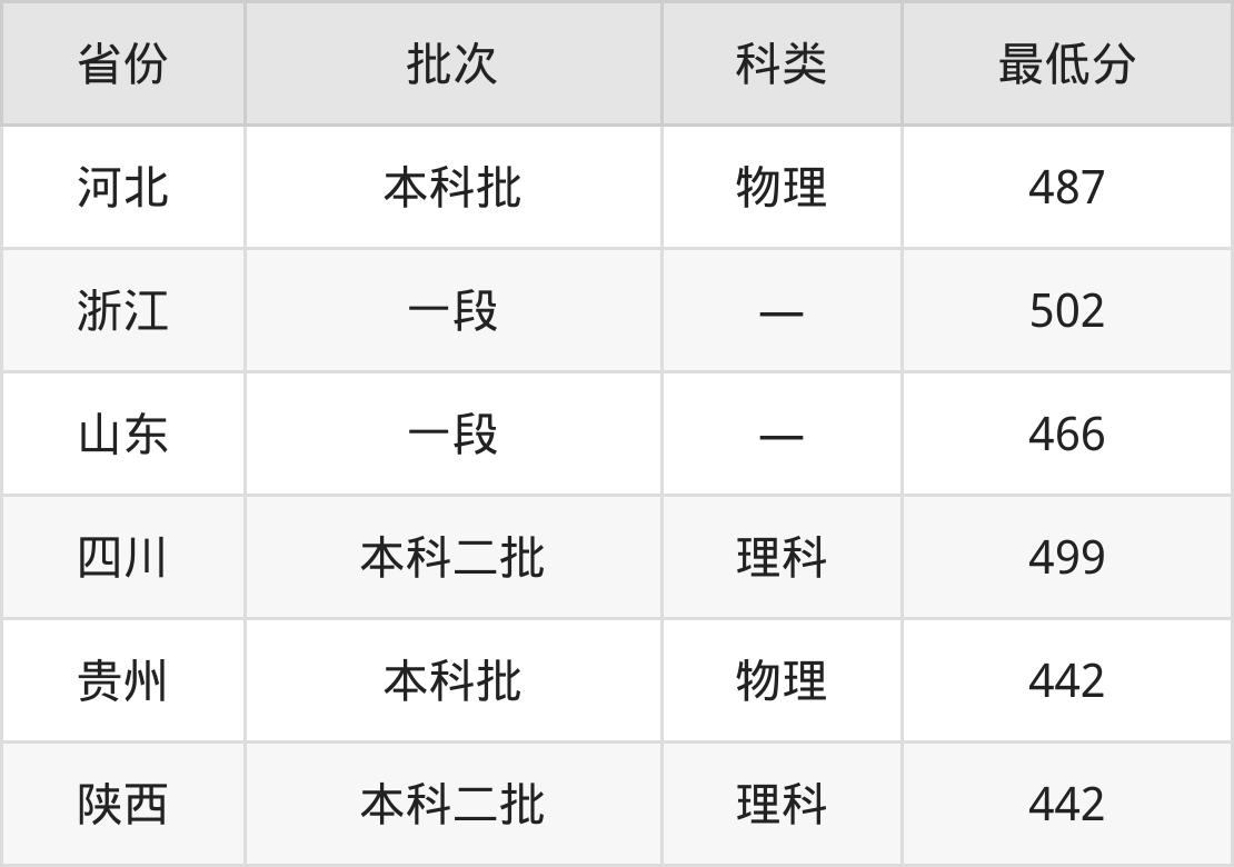 新疆理工学院测控技术与仪器专业在全国各省最低录取分数线为442分(贵州物理类),除此之外,在其余地区的最低分为浙江502分、山东466分、四川理科499分、陕西理科442分等,以上数据均为2024年数据,供2025年高考生参考。