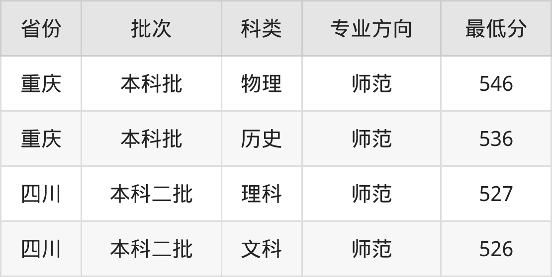 成都师范学院心理学专业录取分数线从526分到546分不等,最低分数线如下: