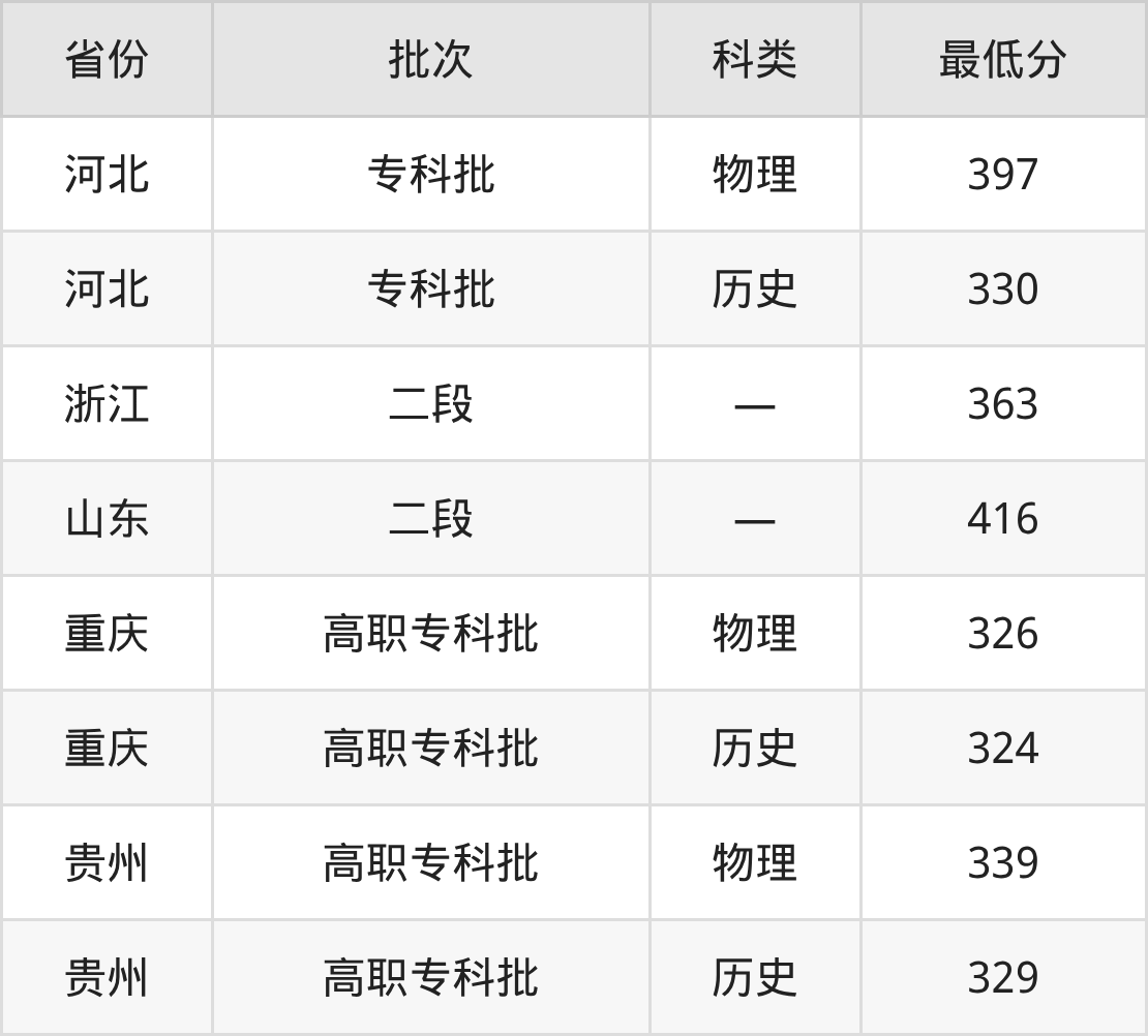 重庆传媒职业学院数字媒体技术专业在全国各省最低录取分数线为324分(重庆历史类),除此之外,在其余地区的最低分为河北历史类330分、浙江363分、山东416分、贵州历史类329分,以上数据均为2025年数据,供2026年高考生参考。