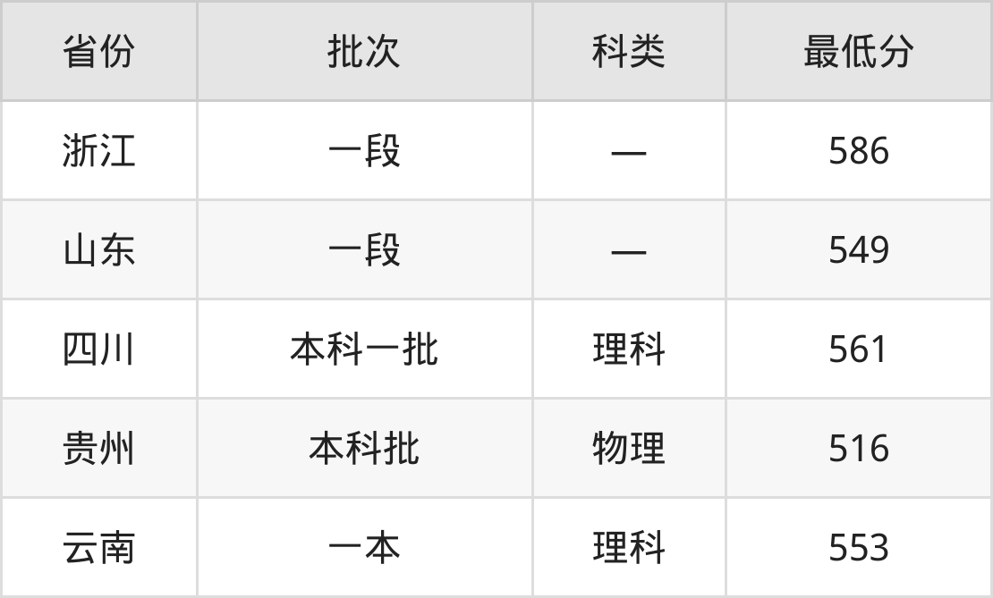 浙大城市学院计算机科学与技术专业在全国各省最低录取分数线为516分(贵州物理类),除此之外,在其余地区的最低分为云南理科553分、浙江586分、山东549分、四川理科561分,以上数据均为2024年数据,供2025年高考生参考。