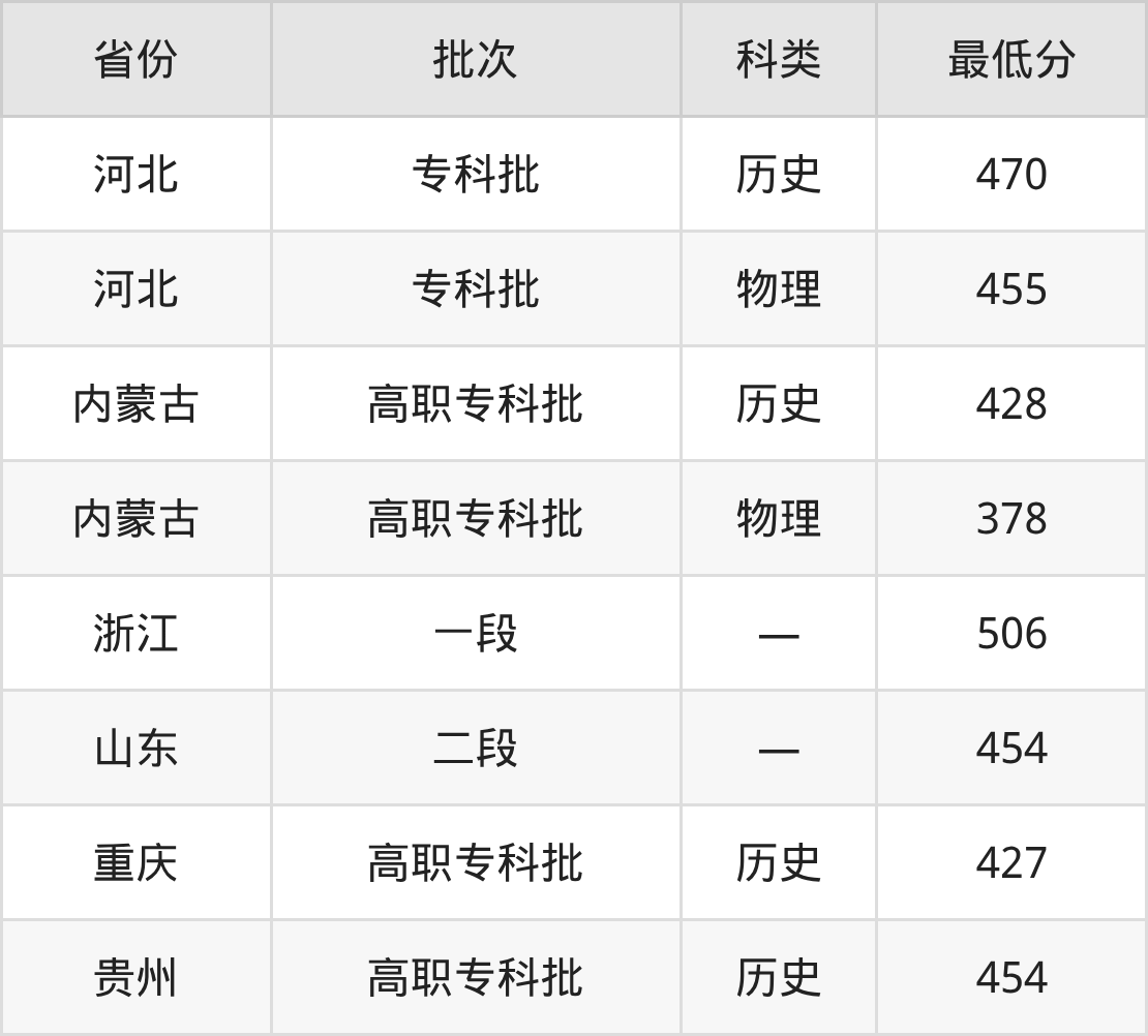 上海民航职业技术学院民航安全技术管理专业在全国各省最低录取分数线为378分(内蒙古物理类),除此之外,在其余地区的最低分为河北物理类455分、浙江506分、山东454分、重庆历史类427分等,以上数据均为2025年数据,供2026年高考生参考。