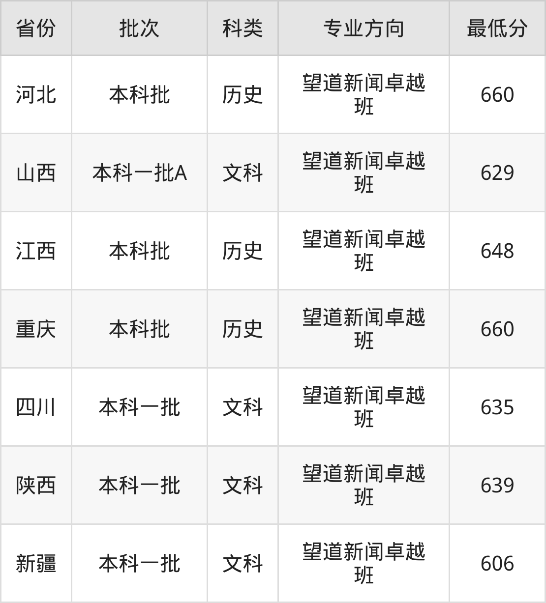 复旦大学新闻学专业录取分数线从606分到660分不等,最低分数线如下: