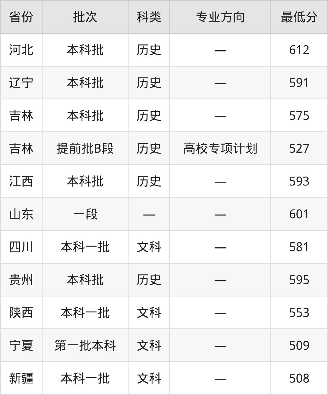 西北大学新闻传播学类专业在全国各省最低录取分数线为508分(新疆文科),除此之外,在其余地区的最低分为陕西文科553分、宁夏文科509分、河北历史类612分、吉林历史类527分等,以上数据均为2024年数据,供2025年高考生参考。