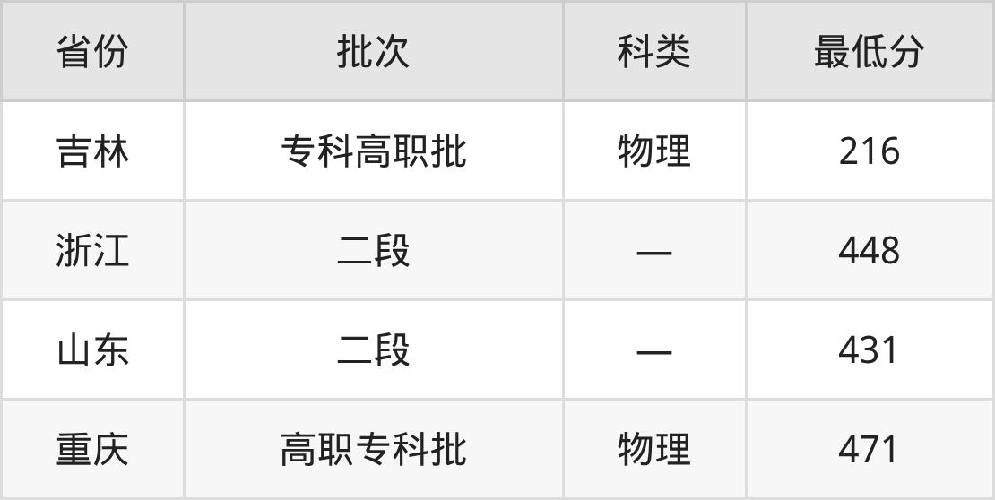 昆明冶金高等专科学校机械制造及自动化专业录取分数线从216分到471分不等,最低分数线如下: