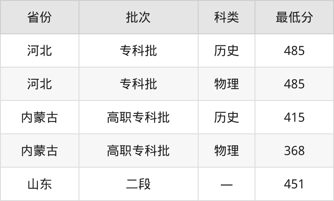 天津现代职业技术学院药品生物技术专业在全国各省最低录取分数线为368分(内蒙古物理类),除此之外,在其余地区的最低分为河北历史类485分、山东451分,以上数据均为2025年数据,供2026年高考生参考。