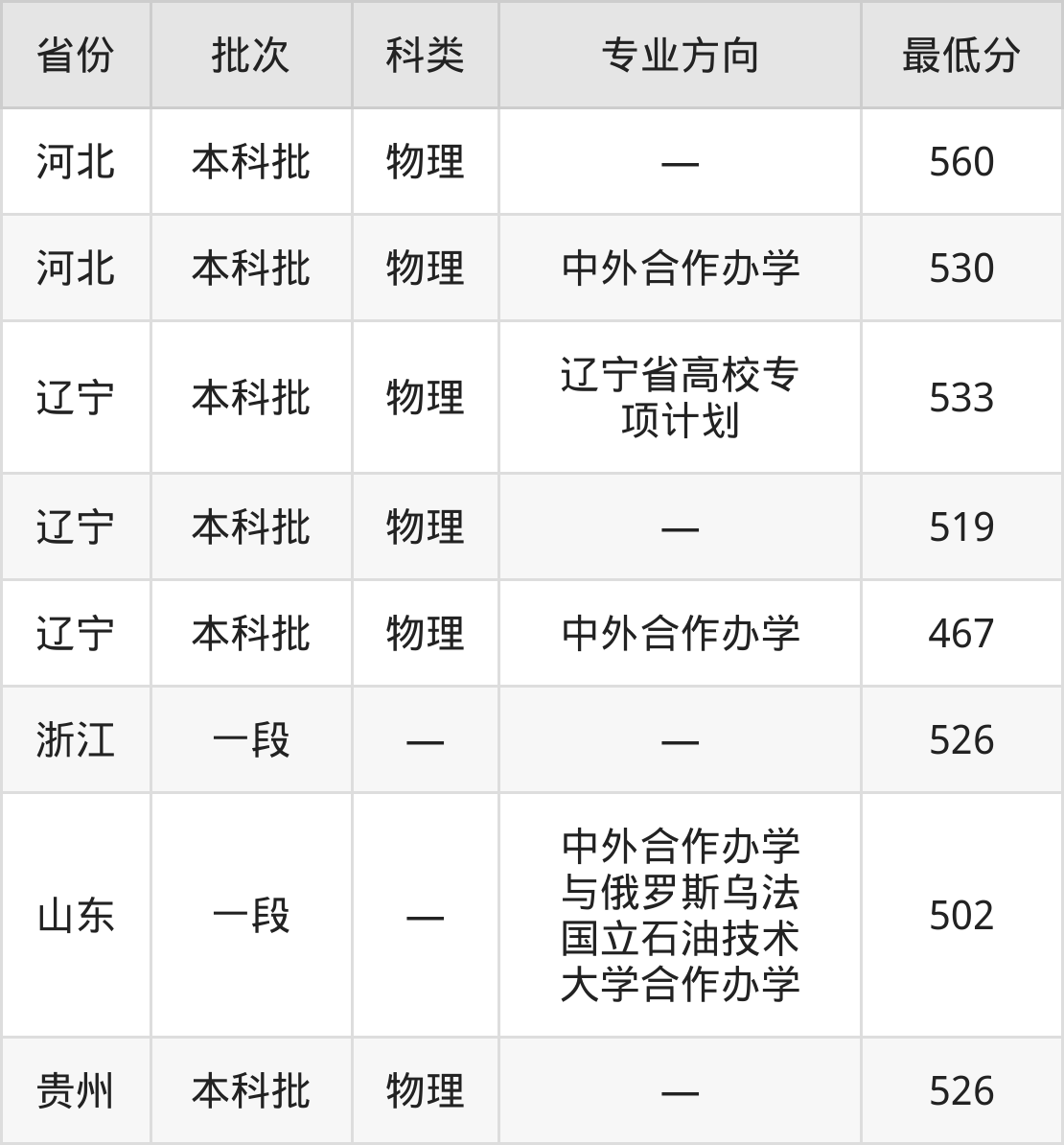 辽宁石油化工大学电气工程及其自动化专业录取分数线从467分到560分不等,最低分数线如下:
