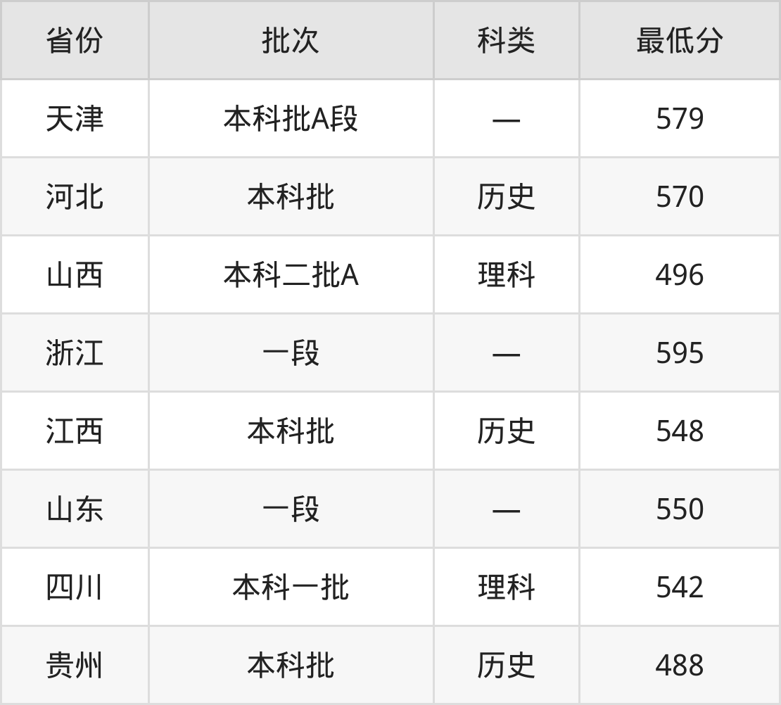 浙江中医药大学英语专业在全国各省最低录取分数线为488分(贵州历史类),除此之外,在其余地区的最低分为河北历史类570分、山西理科496分、浙江595分、江西历史类548分等,以上数据均为2024年数据,供2025年高考生参考。