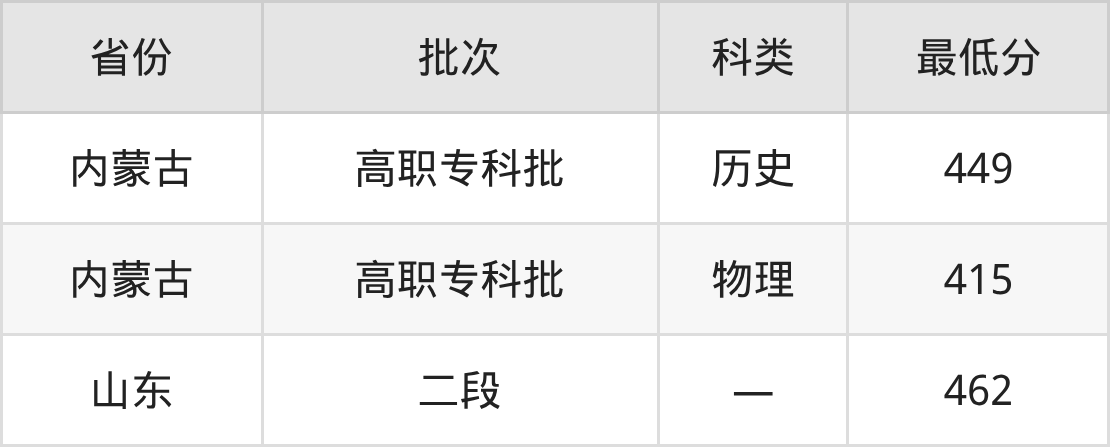 包头铁道职业技术学院铁道机车运用与维护专业录取分数线从415分到462分不等,最低分数线如下:
