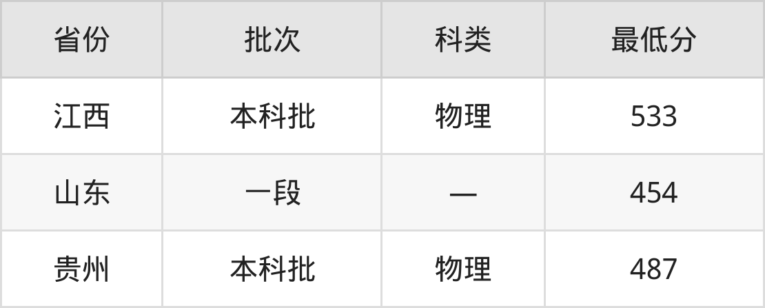 广东药科大学食品质量与安全专业在全国各省最低录取分数线为454分(山东),除此之外,在其余地区的最低分为江西物理类533分、贵州物理类487分,以上数据均为2024年数据,供2025年高考生参考。