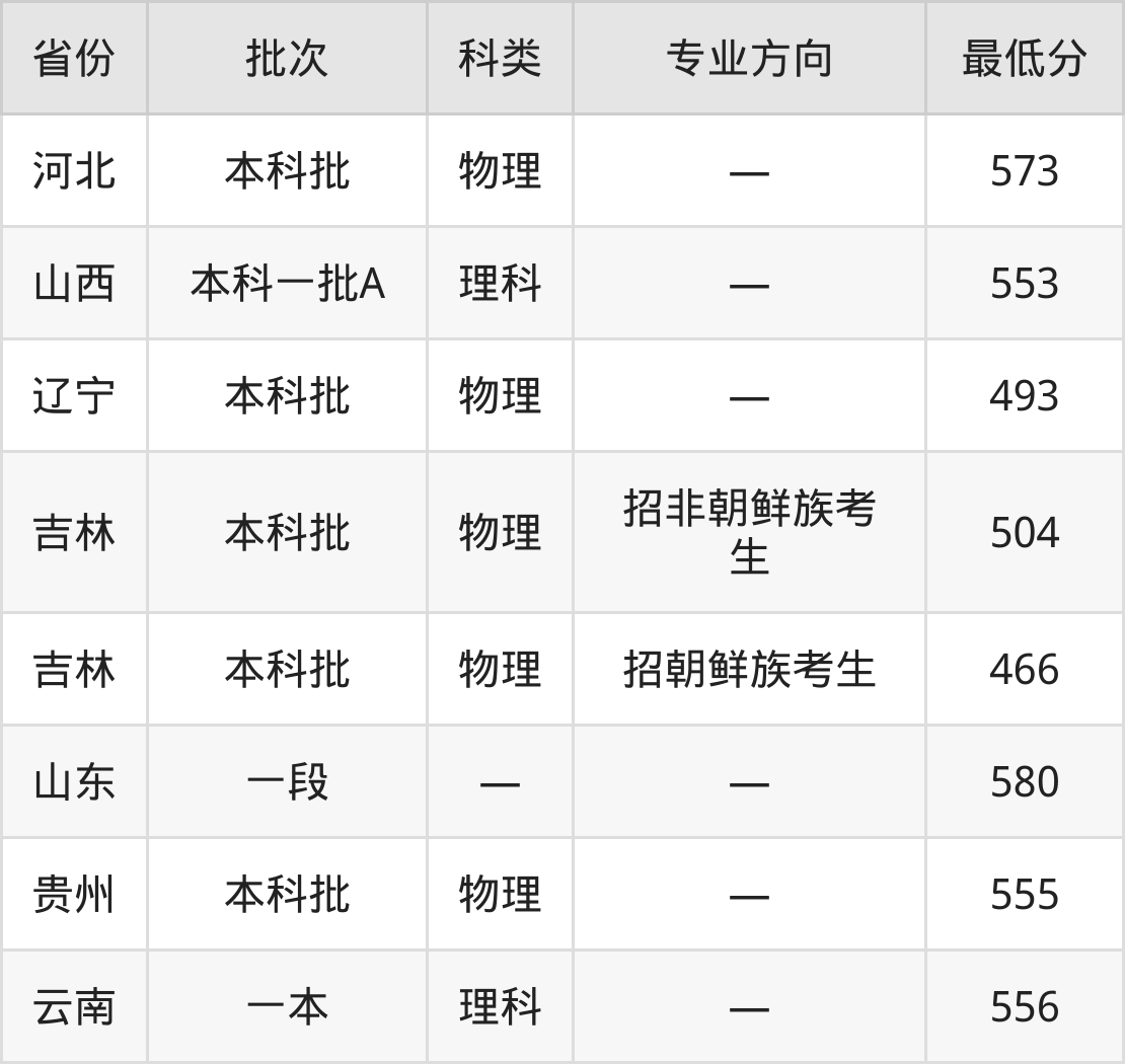 延边大学中医学专业录取分数线从466分到580分不等,最低分数线如下: