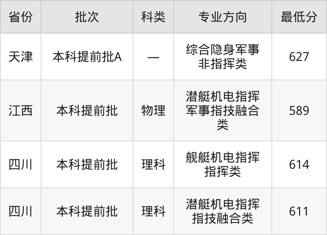 中国人民解放军海军工程大学轮机工程专业录取分数线从589分到627分不等,最低分数线如下: