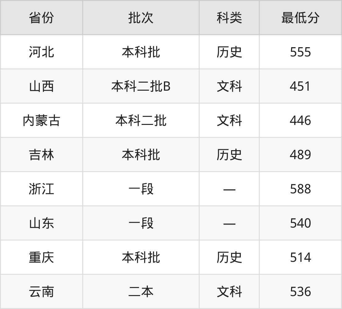 商丘师范学院法学专业在全国各省最低录取分数线为446分(内蒙古文科),除此之外,在其余地区的最低分为山东540分、重庆历史类514分、云南文科536分、河北历史类555分等,以上数据均为2024年数据,供2025年高考生参考。