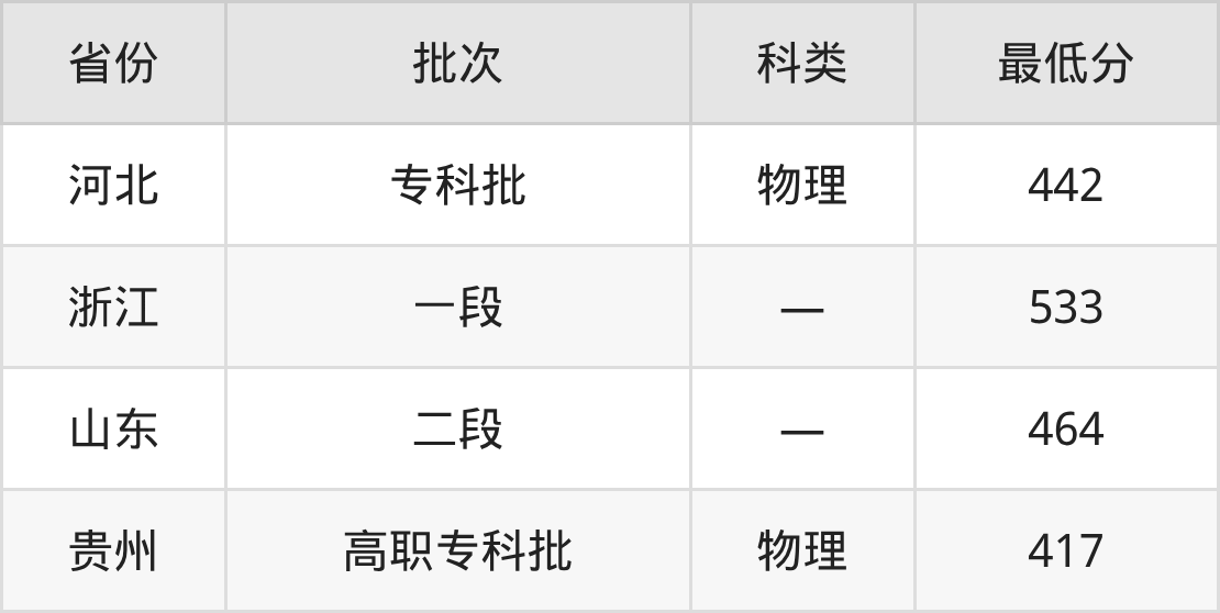 汉江师范学院大数据与会计专业在全国各省最低录取分数线为417分(贵州物理类),除此之外,在其余地区的最低分为河北物理类442分、浙江533分、山东464分,以上数据均为2025年数据,供2026年高考生参考。