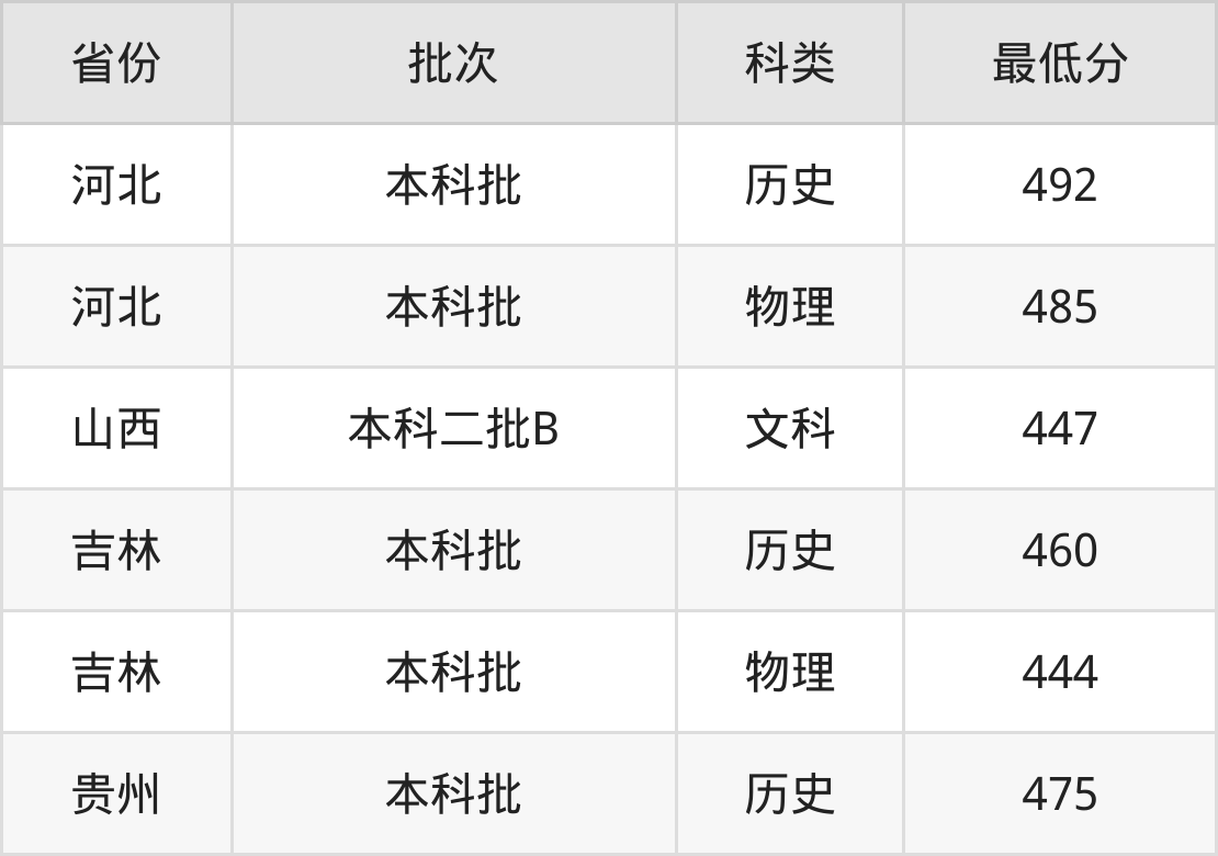吉林警察学院朝鲜语专业录取分数线从444分到492分不等,最低分数线如下: