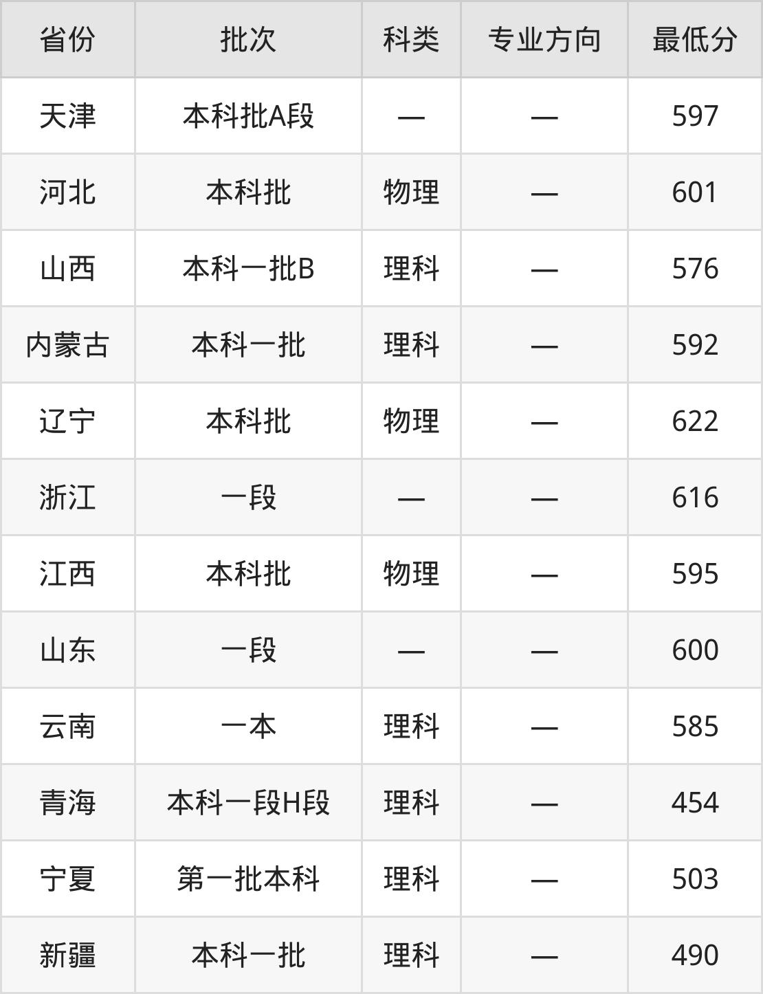 宁波大学电子信息类专业录取分数线从454分到622分不等,在部分地区的最低分数线如下: