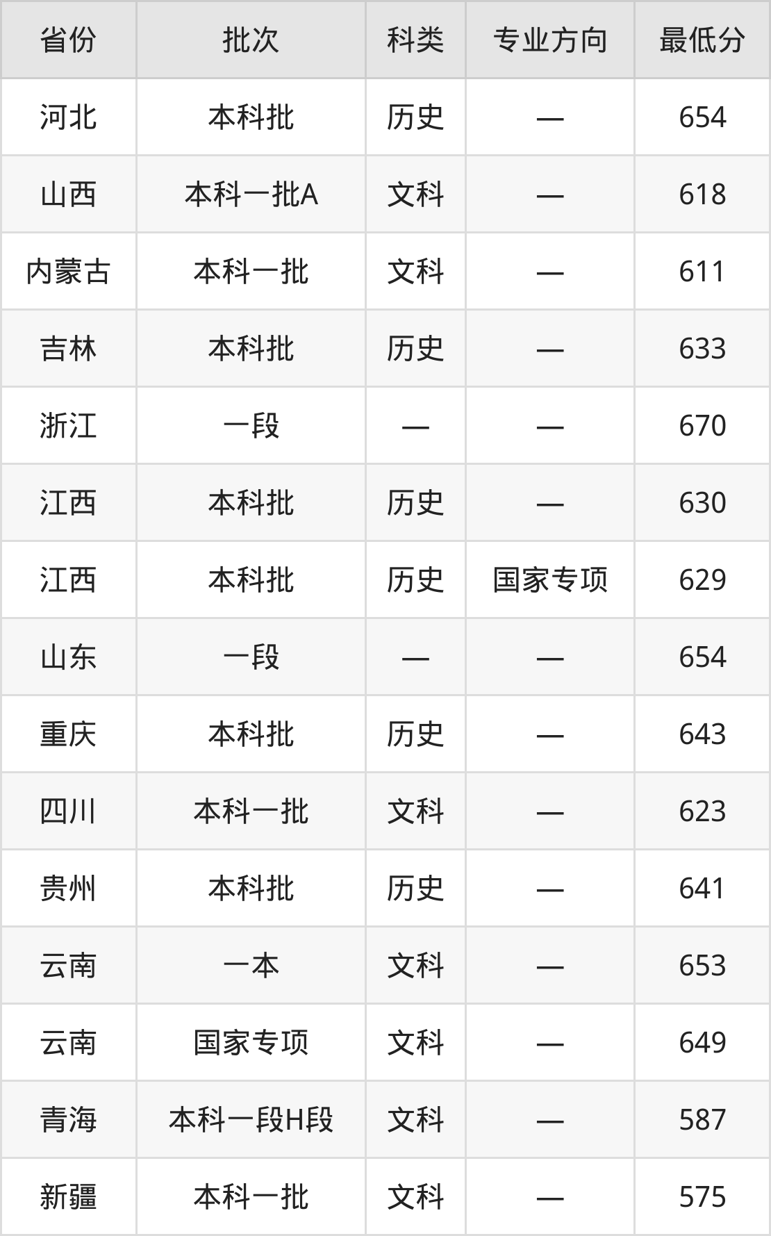 北京师范大学历史学类专业录取分数线从575分到670分不等,在部分地区的最低分数线如下: