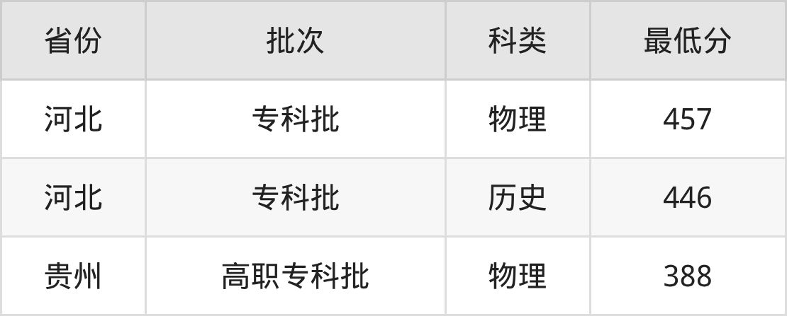 宝鸡职业技术学院机电一体化技术专业录取分数线从388分到457分不等,最低分数线如下: