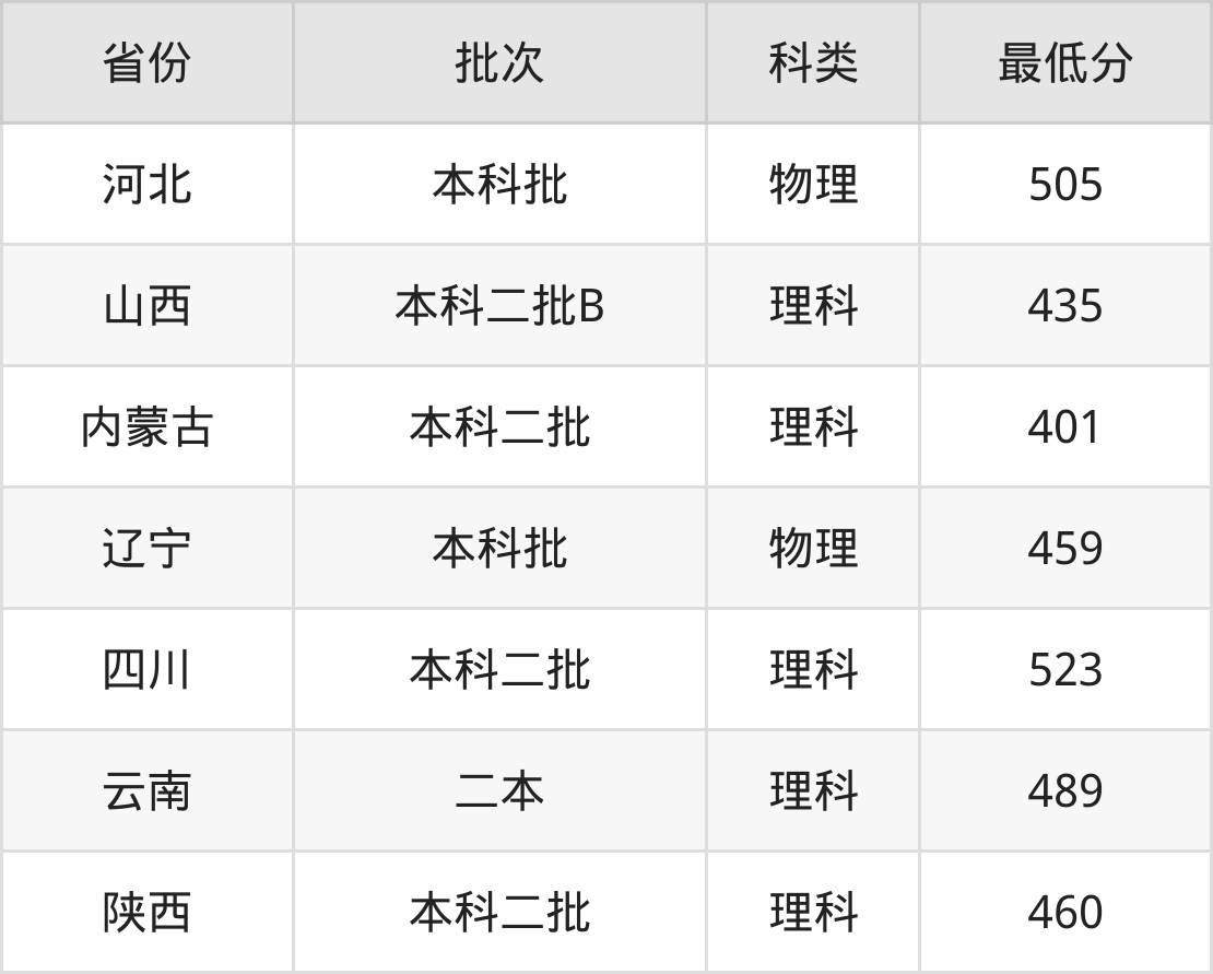 洛阳理工学院环境工程专业在全国各省最低录取分数线为401分(内蒙古理科),除此之外,在其余地区的最低分为河北物理类505分、山西理科435分、辽宁物理类459分、四川理科523分等,以上数据均为2024年数据,供2025年高考生参考。