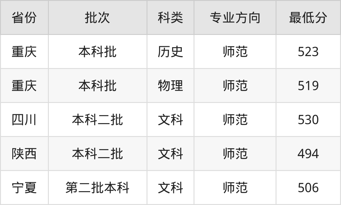 长江师范学院汉语言文学专业在全国各省最低录取分数线为494分(陕西文科),除此之外,在其余地区的最低分为宁夏文科506分、重庆物理类519分、四川文科530分,以上数据均为2024年数据,供2025年高考生参考。