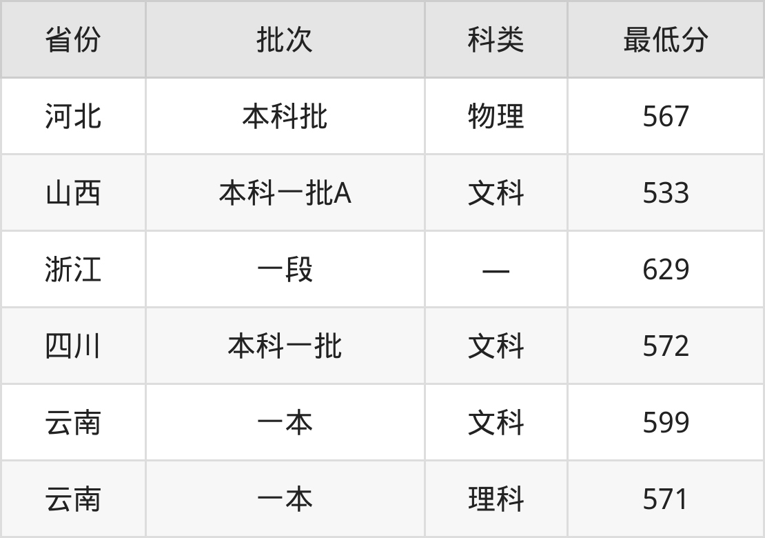 云南大学日语专业在全国各省最低录取分数线为533分(山西文科),除此之外,在其余地区的最低分为河北物理类567分、浙江629分、四川文科572分、云南理科571分,以上数据均为2024年数据,供2025年高考生参考。
