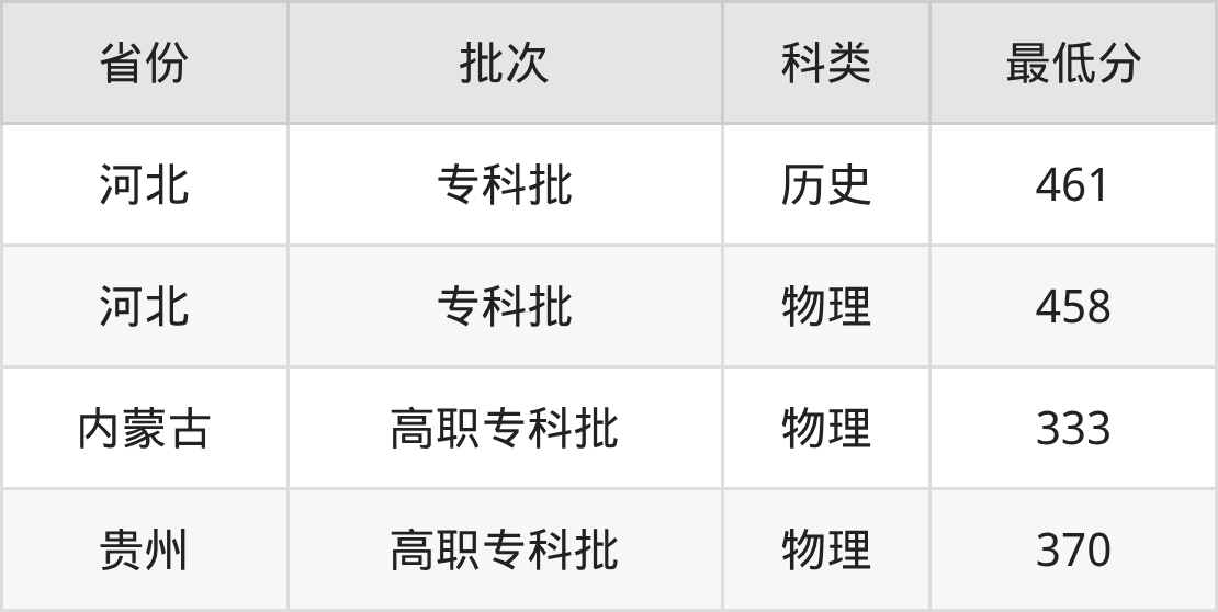 天津工业职业学院机电一体化技术专业录取分数线从333分到461分不等,最低分数线如下: