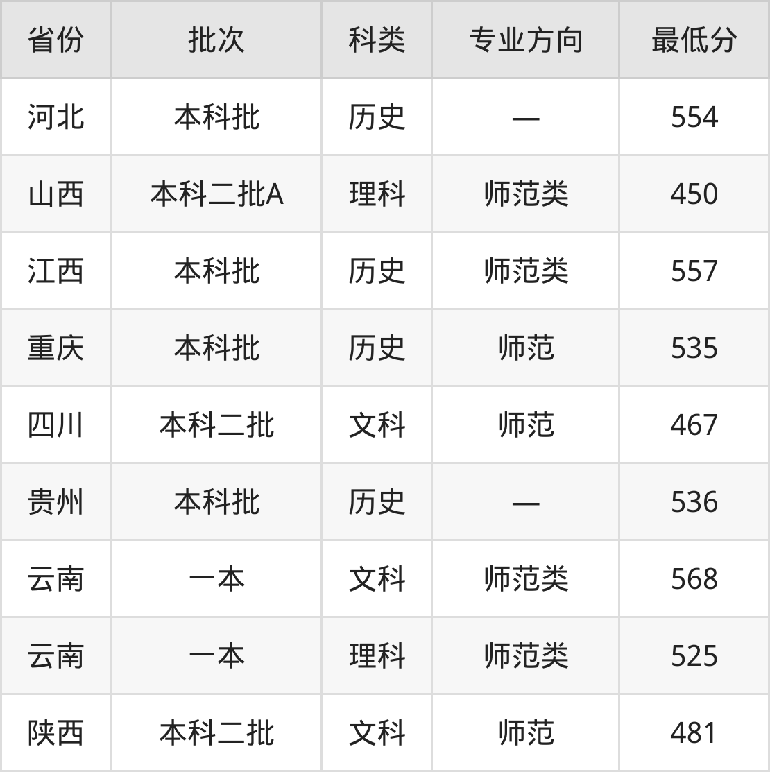 广西师范大学学前教育专业在全国各省最低录取分数线为450分(山西理科),除此之外,在其余地区的最低分为江西历史类557分、重庆历史类535分、四川文科467分、贵州历史类536分等,以上数据均为2024年数据,供2025年高考生参考。