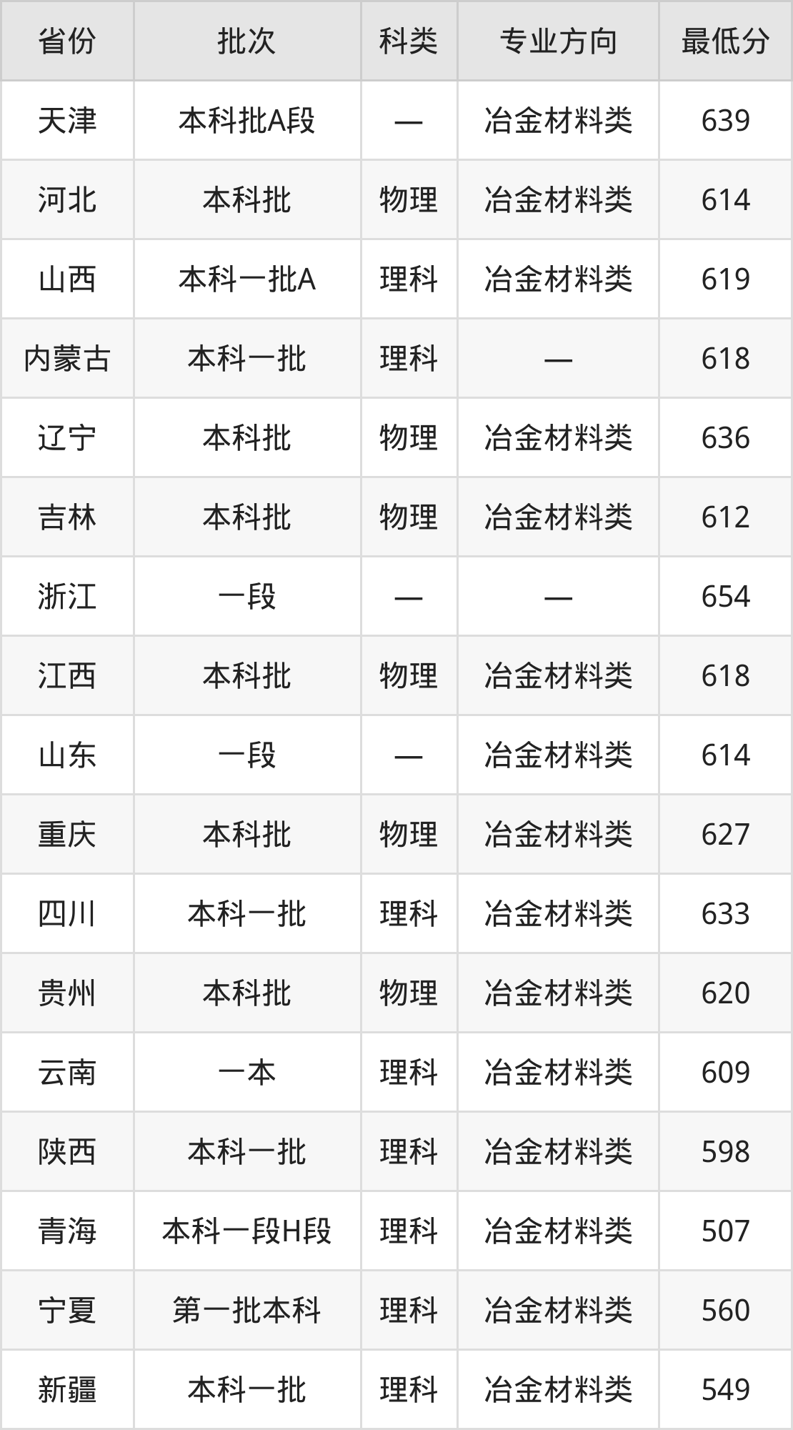中南大学材料类专业录取分数线从507分到654分不等,在部分地区的最低分数线如下:
