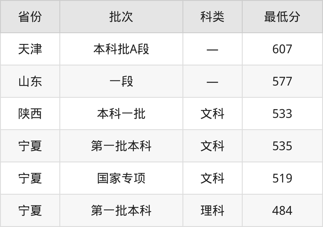 宁夏大学经济学专业在全国各省最低录取分数线为484分(宁夏理科),除此之外,在其余地区的最低分为天津607分、山东577分、陕西文科533分,以上数据均为2024年数据,供2025年高考生参考。