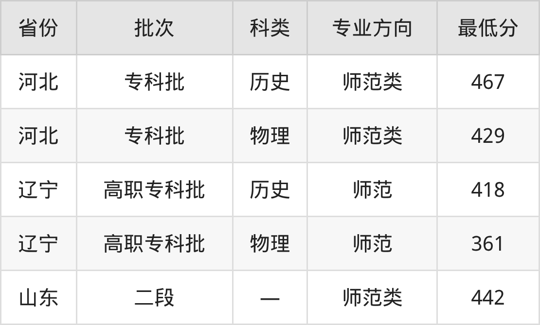 大同师范高等专科学校小学教育专业录取分数线从361分到467分不等,最低分数线如下: