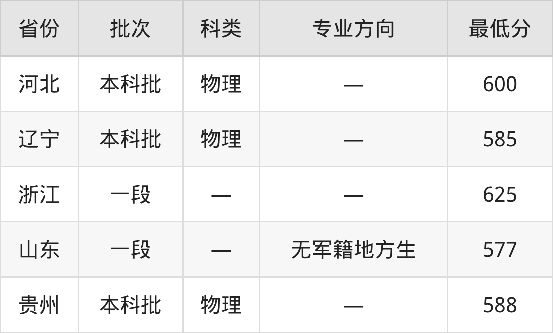 中国人民解放军海军军医大学护理学专业在全国各省最低录取分数线为577分(山东),除此之外,在其余地区的最低分为河北物理类600分、辽宁物理类585分、浙江625分、贵州物理类588分,以上数据均为2025年数据,供2026年高考生参考。