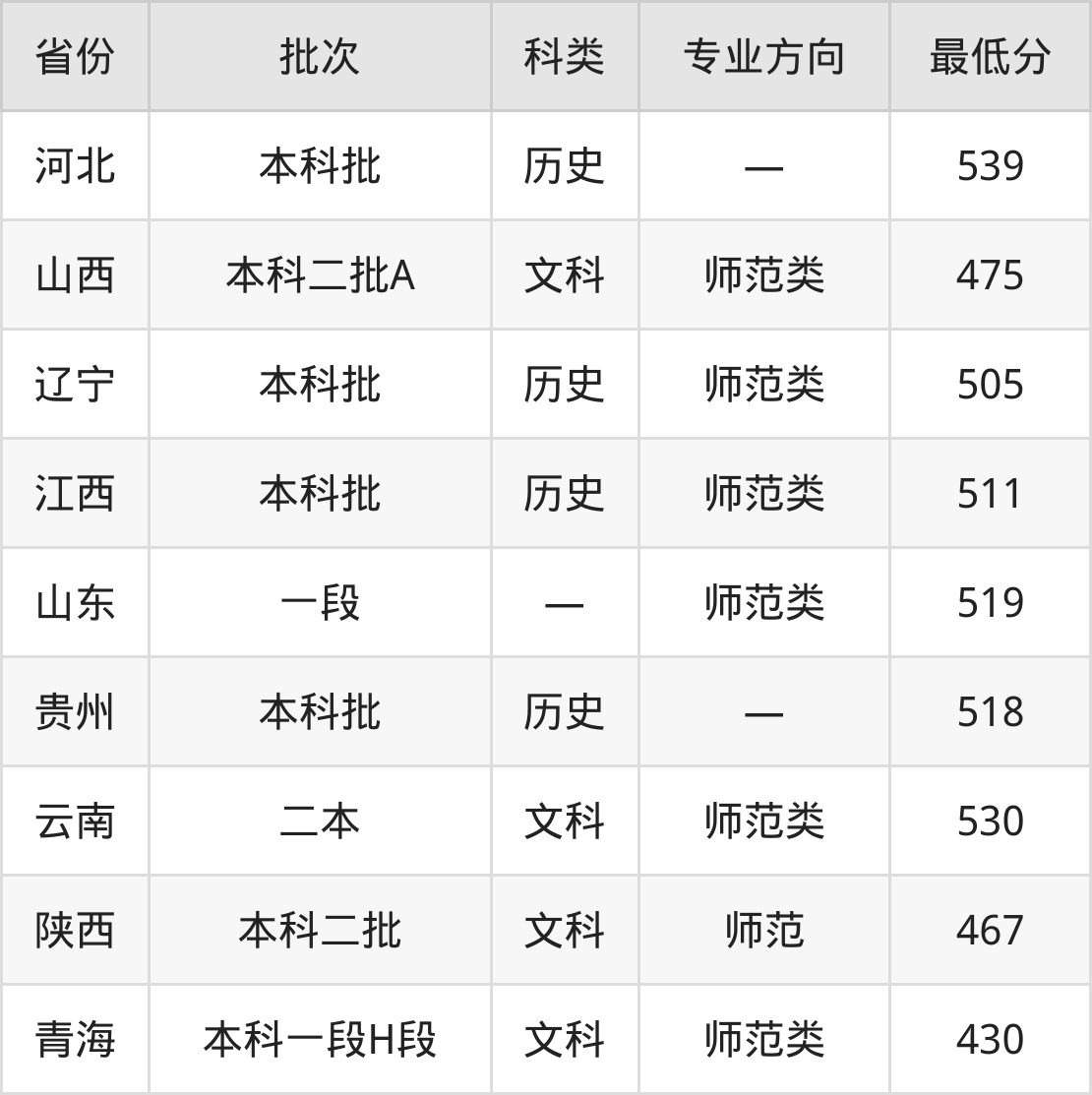 长治学院历史学专业录取分数线从430分到539分不等,最低分数线如下: