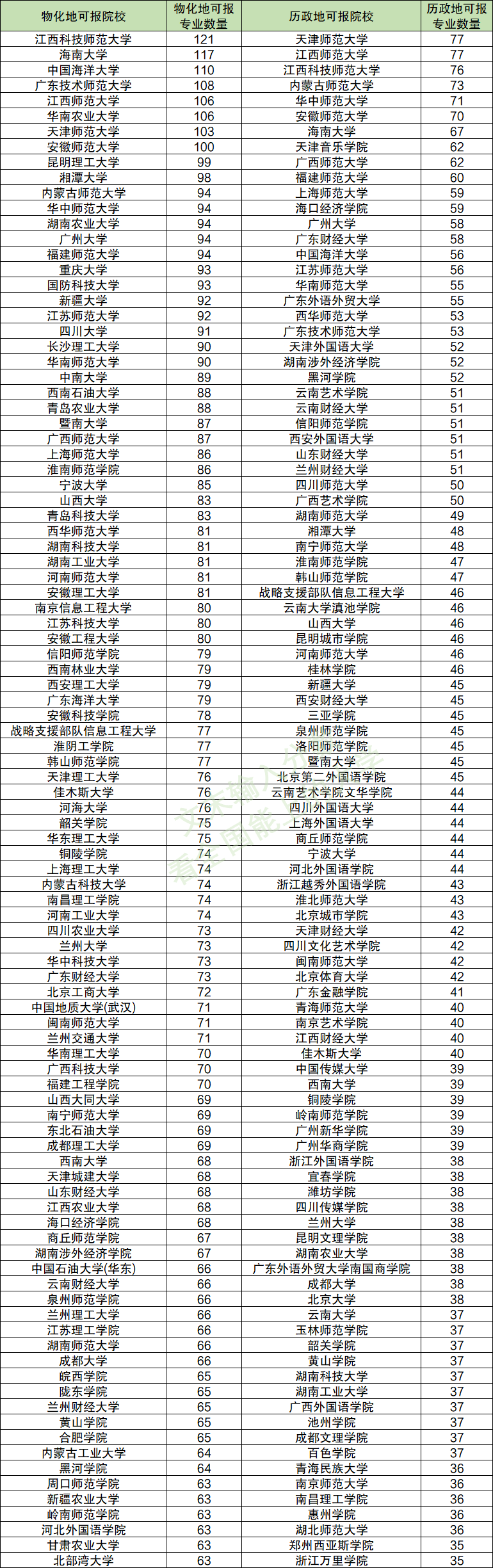 如江西师范大学物化地可报106个专业,历政地只能报77个专业;天津师范大学物化地可报103个专业,历政地可报77个专业;湘潭大学物化地可报98个专业,历政地可报48个专业等。