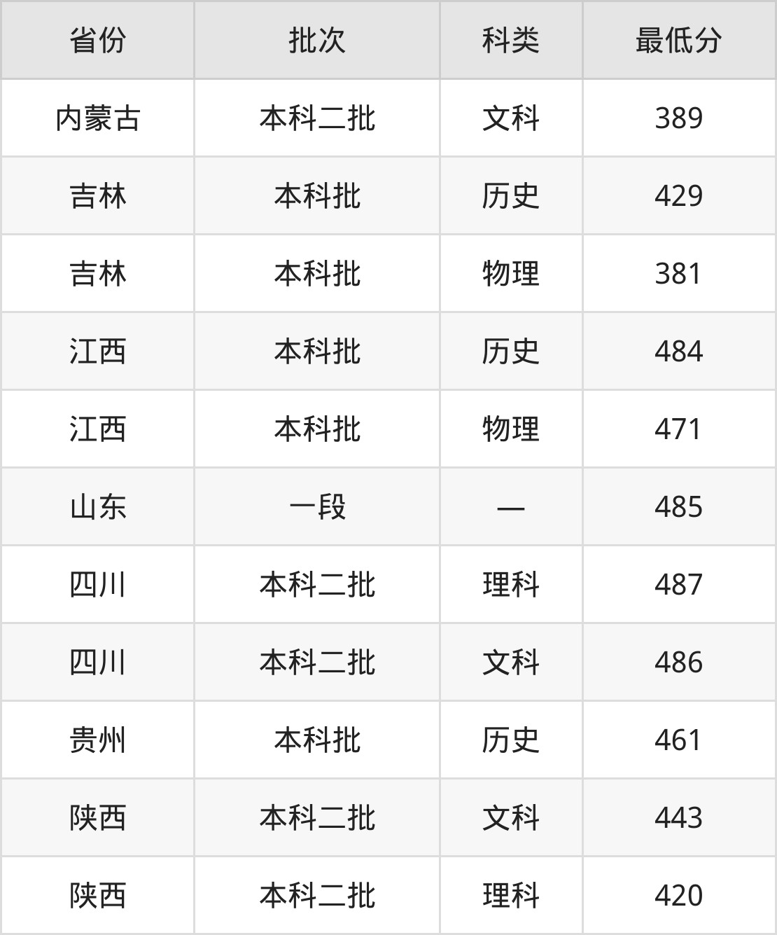 南昌理工学院网络与新媒体专业在全国各省最低录取分数线为381分(吉林物理类),除此之外,在其余地区的最低分为内蒙古文科389分、江西物理类471分、山东485分、四川文科486分等,以上数据均为2024年数据,供2025年高考生参考。