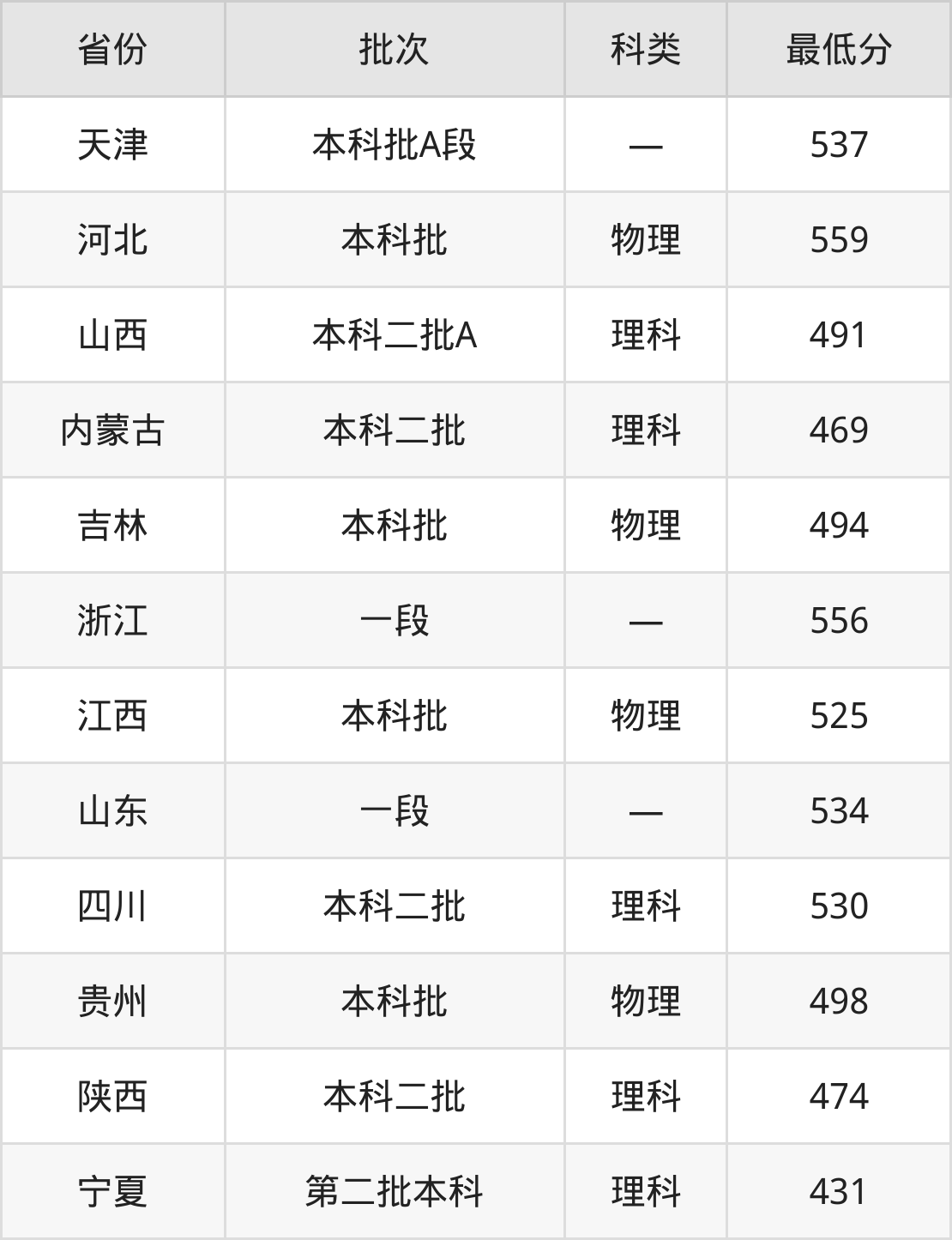 长春大学软件工程专业录取分数线从431分到559分不等,在部分地区的最低分数线如下: