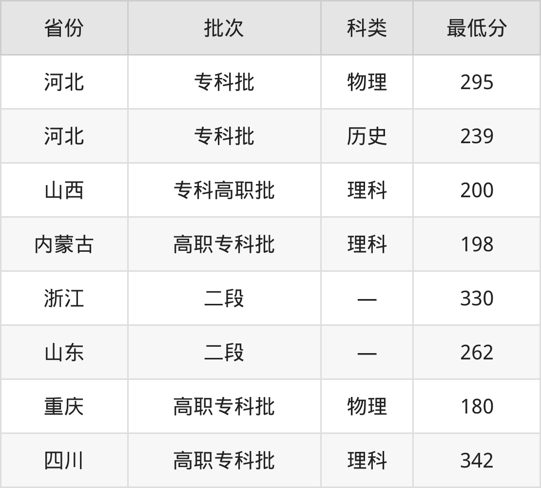 海口经济学院无人机应用技术专业在全国各省最低录取分数线为180分(重庆物理类),除此之外,在其余地区的最低分为山西理科200分、内蒙古理科198分、浙江330分、山东262分等,以上数据均为2024年数据,供2025年高考生参考。