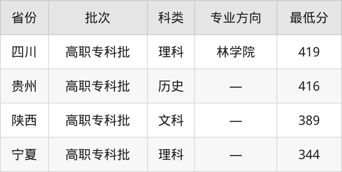 榆林职业技术学院林业技术专业录取分数线从344分到419分不等,最低分数线如下: