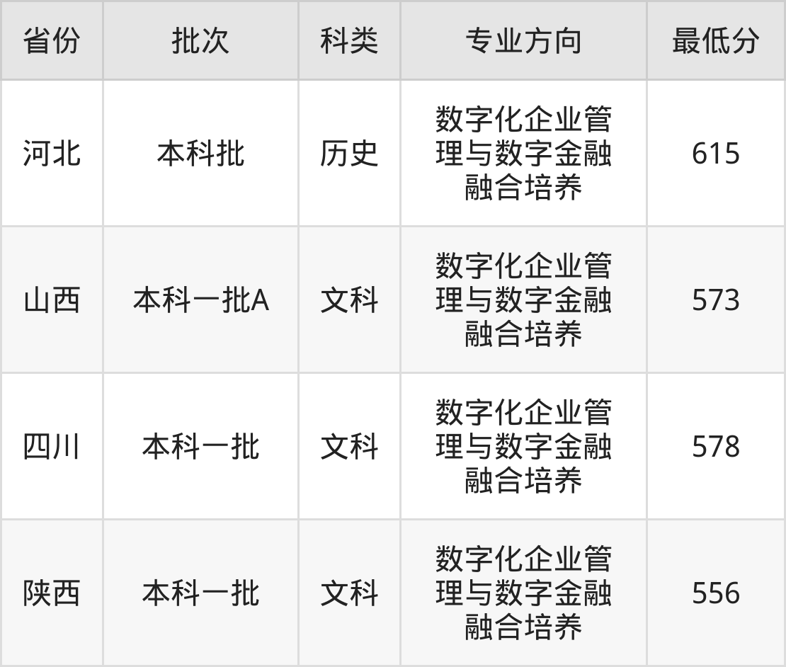 西安电子科技大学工商管理类专业在全国各省最低录取分数线为556分(陕西文科),除此之外,在其余地区的最低分为河北历史类615分、山西文科573分、四川文科578分,以上数据均为2024年数据,供2025年高考生参考。