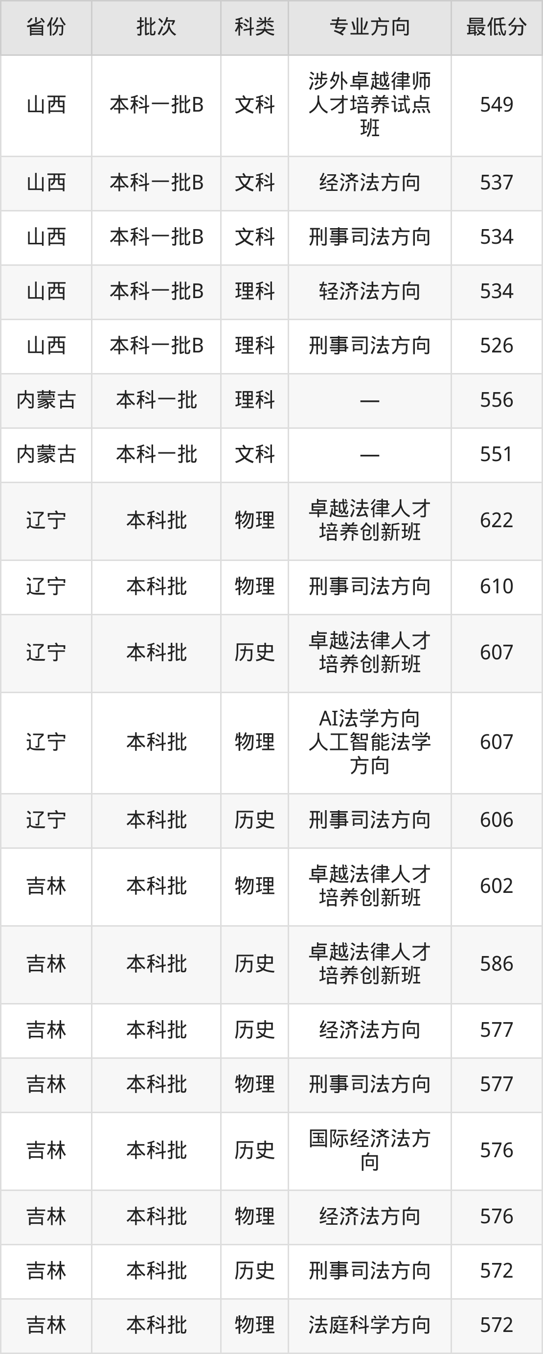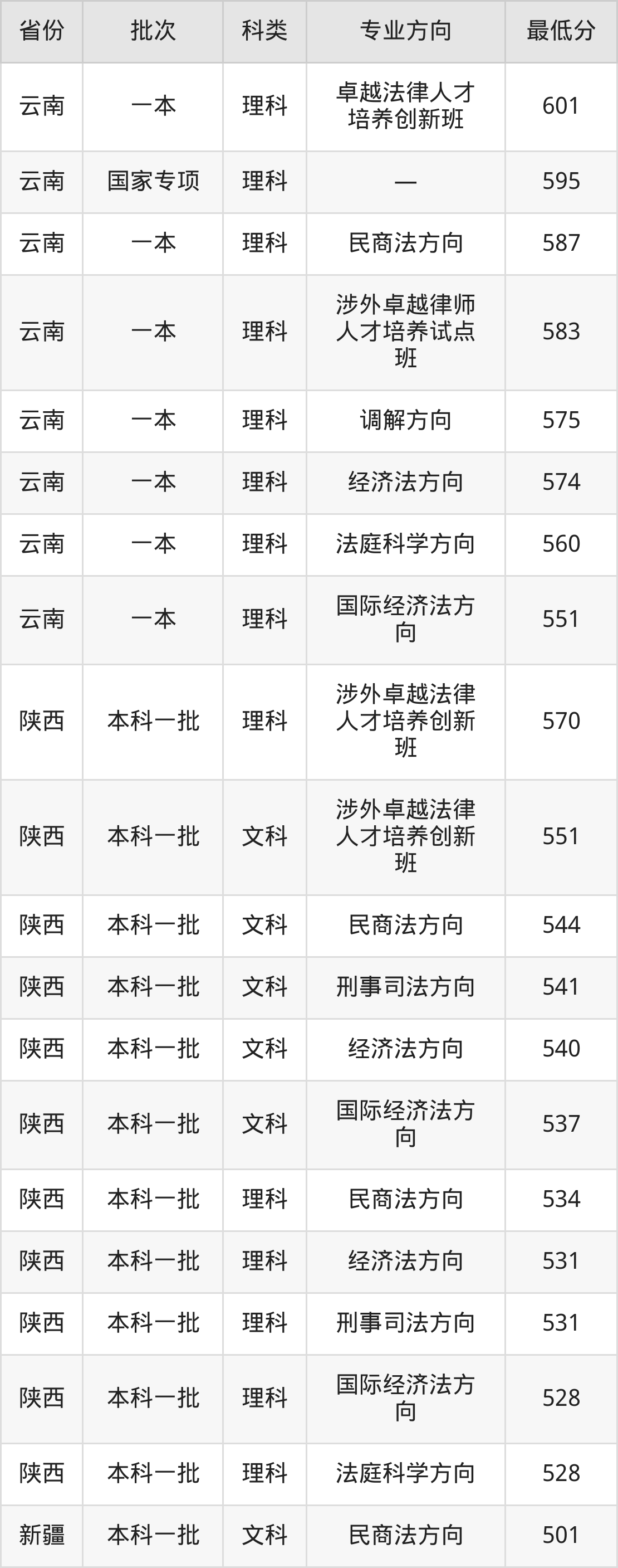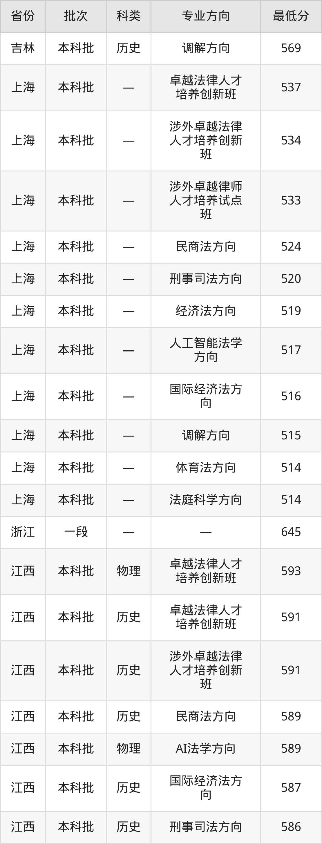 上海政法学院法学专业录取分数线从410分到652分不等,在部分地区的最低分数线如下: