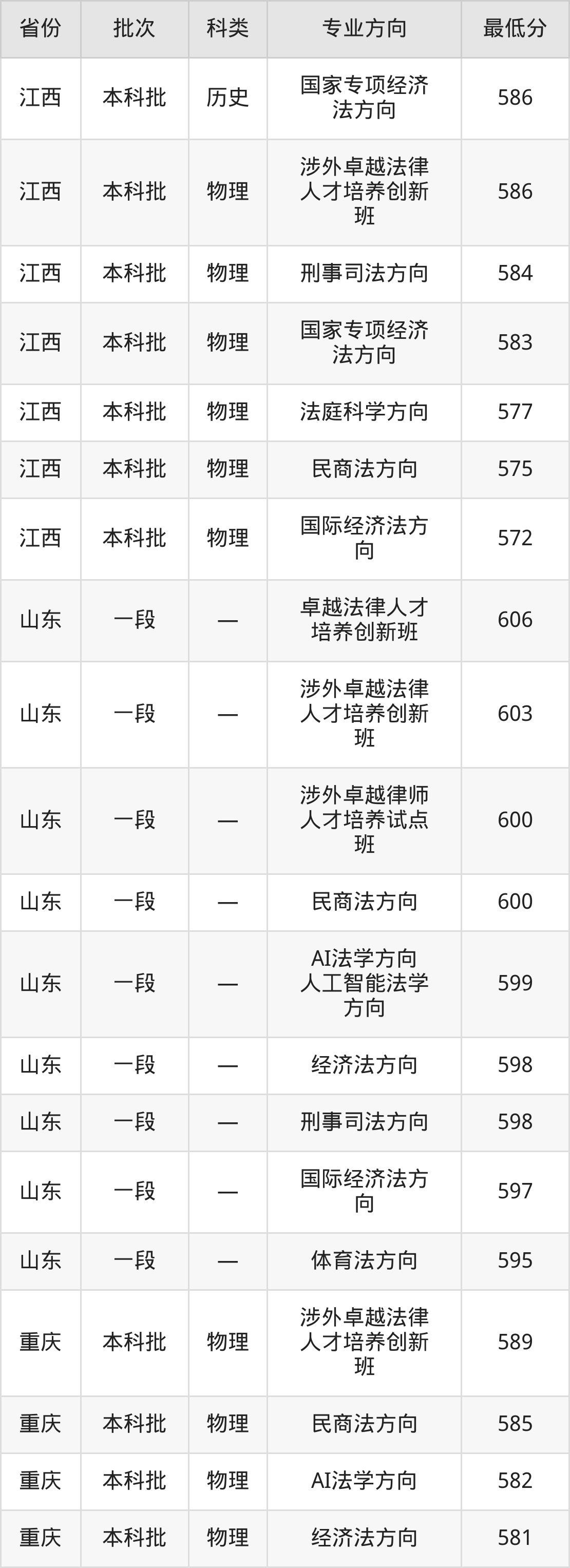 上海政法学院法学专业在全国各省最低录取分数线为410分(新疆理科),除此之外,在其余地区的最低分为重庆历史类573分、四川理科543分、云南理科551分、内蒙古文科551分等,以上数据均为2024年数据,供2025年高考生参考。