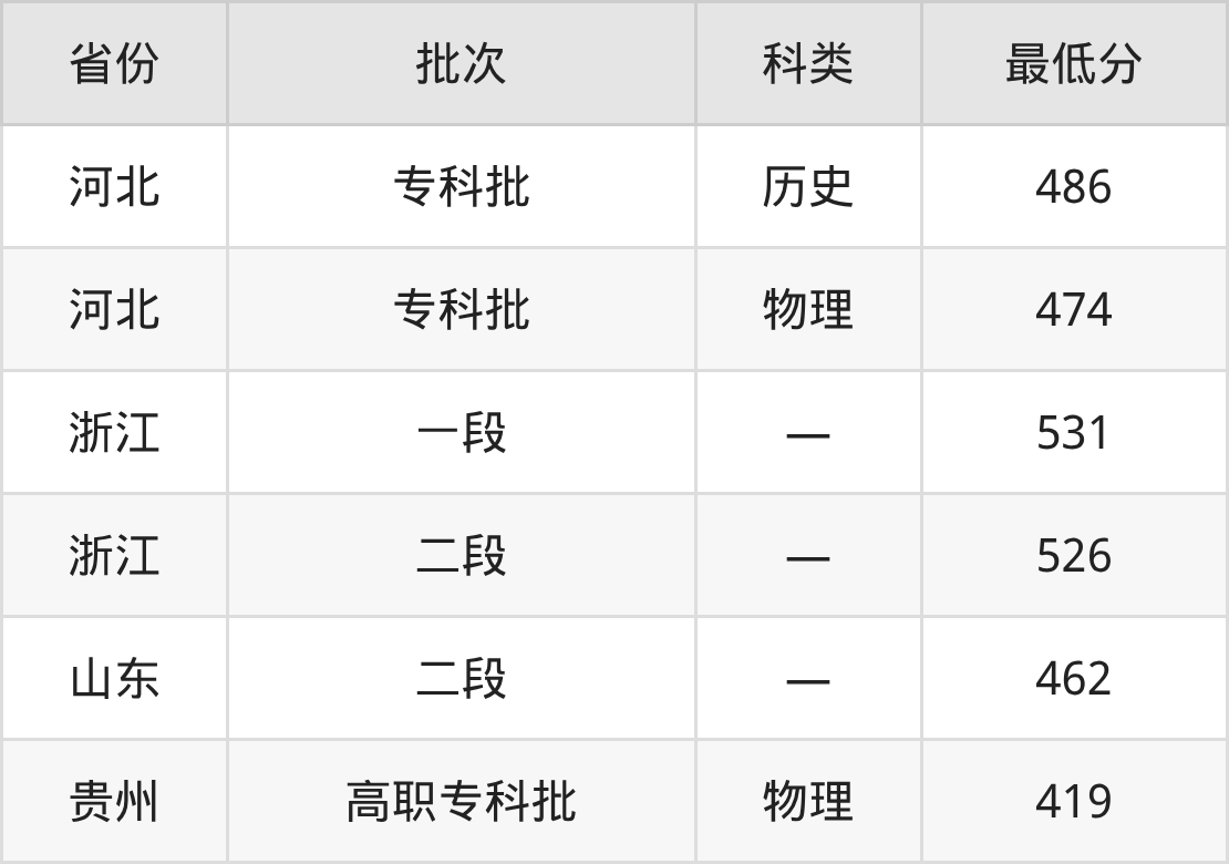 安徽第二医学院口腔医学技术专业在全国各省最低录取分数线为419分(贵州物理类),除此之外,在其余地区的最低分为河北物理类474分、浙江526分、山东462分,以上数据均为2025年数据,供2026年高考生参考。