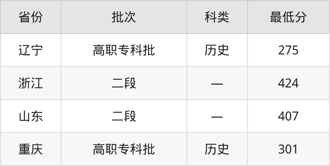 黑龙江建筑职业技术学院数字媒体艺术设计专业在全国各省最低录取分数线为275分(辽宁历史类),除此之外,在其余地区的最低分为重庆历史类301分、浙江424分、山东407分,以上数据均为2024年数据,供2025年高考生参考。