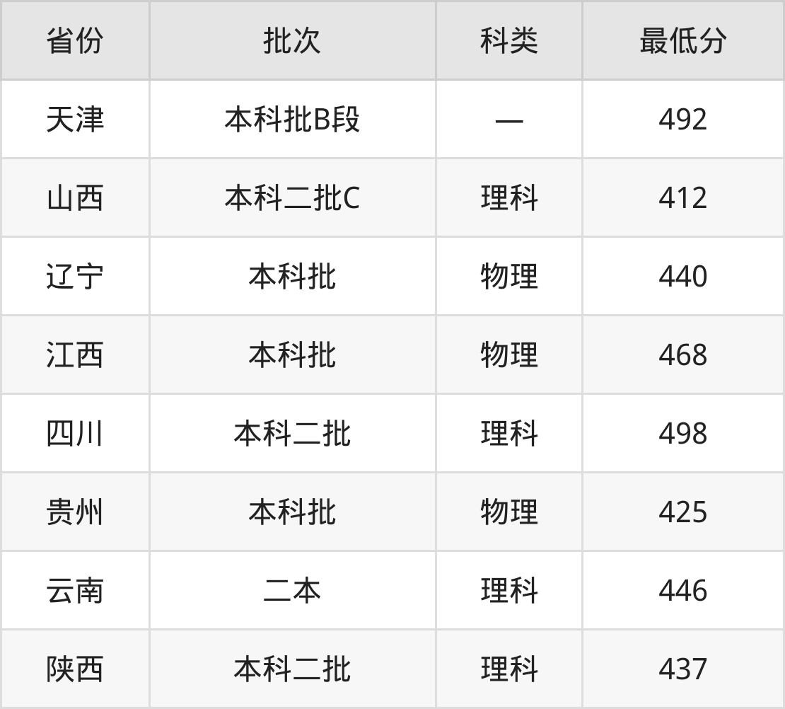 南昌航空大学科技学院土木工程专业在全国各省最低录取分数线为412分(山西理科),除此之外,在其余地区的最低分为江西物理类468分、四川理科498分、贵州物理类425分、云南理科446分等,以上数据均为2024年数据,供2025年高考生参考。