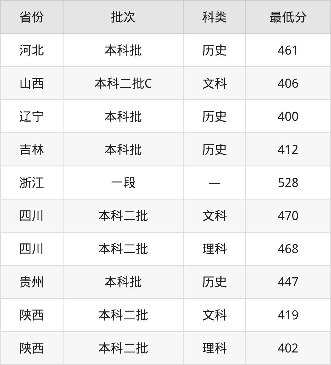 西安翻译学院日语专业在全国各省最低录取分数线为400分(辽宁历史类),除此之外,在其余地区的最低分为浙江528分、四川理科468分、贵州历史类447分、陕西理科402分等,以上数据均为2024年数据,供2025年高考生参考。