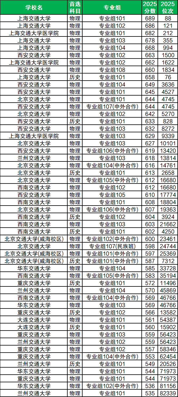 以四川2025年高考招录数据为例,下面是中国八大交通大学录取分数线一览表: