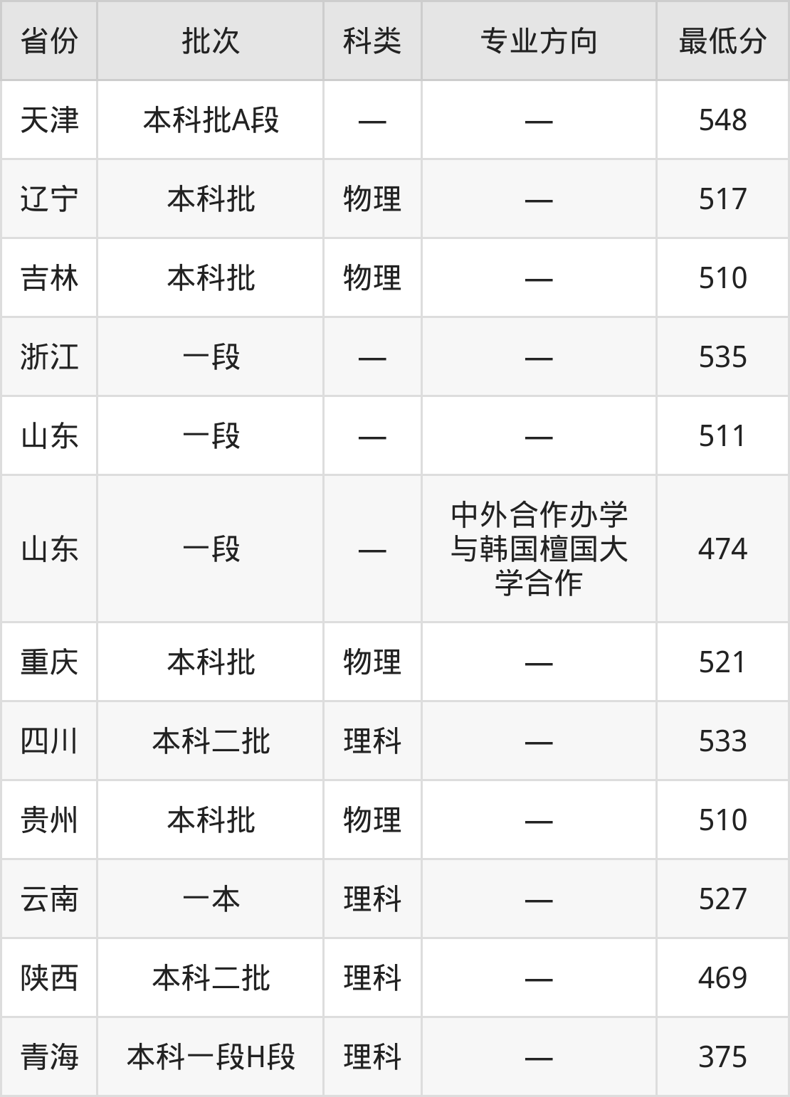 烟台大学材料科学与工程专业录取分数线从375分到548分不等,在部分地区的最低分数线如下: