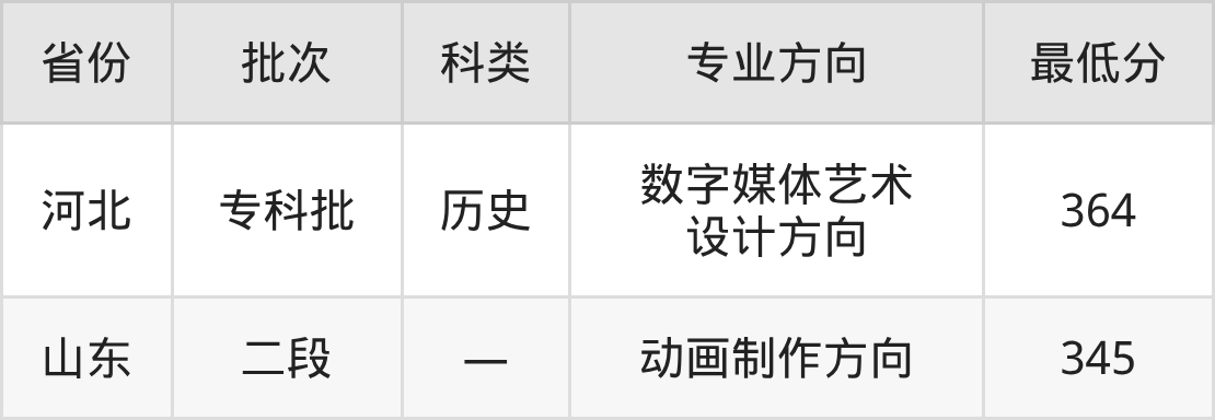武汉光谷职业学院动漫设计专业在全国各省最低录取分数线为345分(山东),除此之外,在其余地区的最低分为河北历史类364分,以上数据均为2025年数据,供2026年高考生参考。