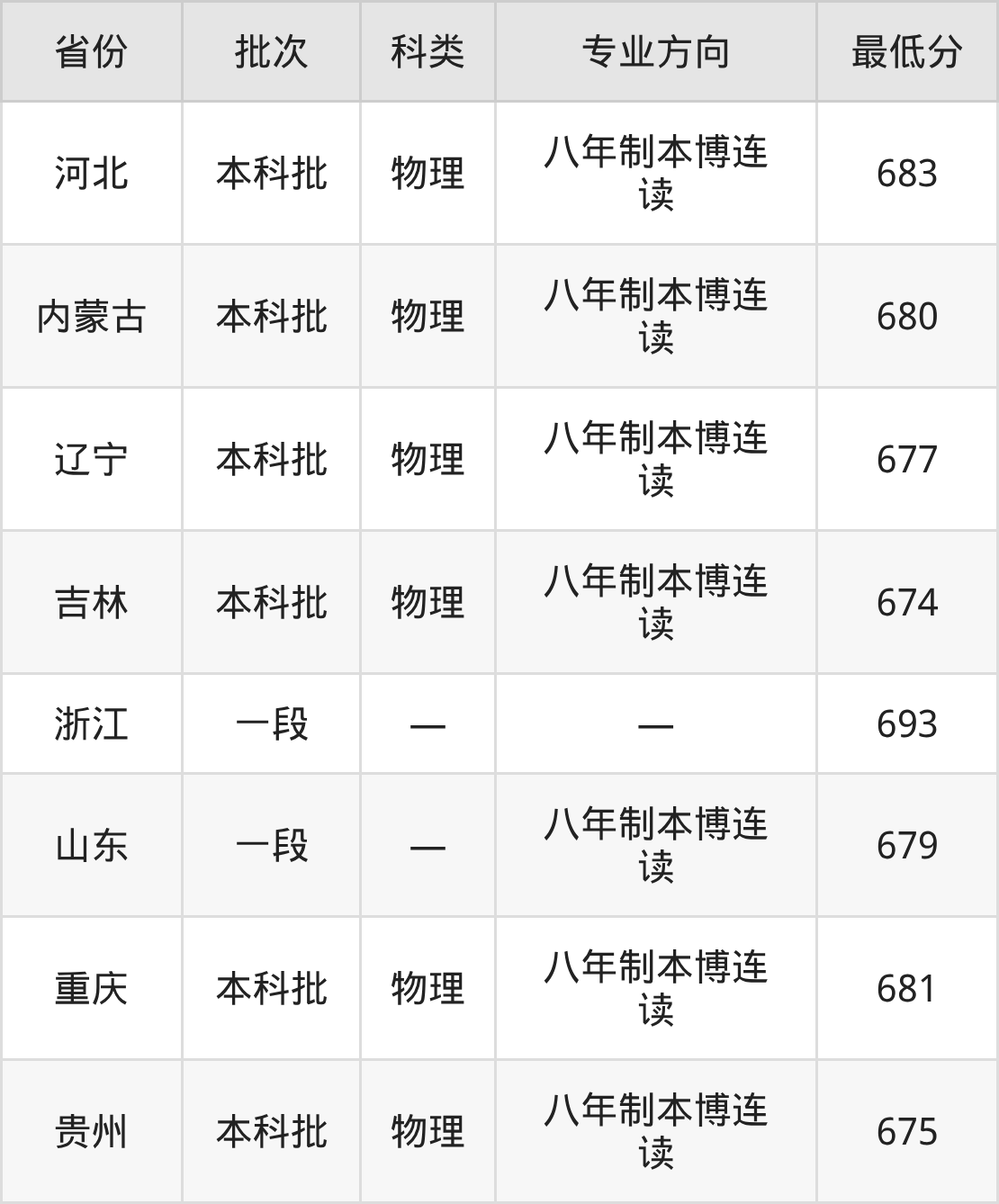 北京大学医学部基础医学专业录取分数线从674分到693分不等,最低分数线如下: